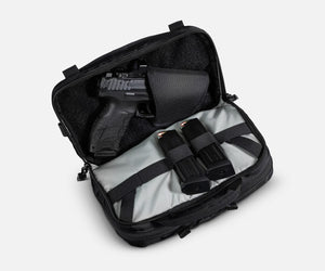 Two options for CCW: store your firearm in the large rear compartment for lightning-fast access via pull tabs (in both corners), or in the hidden pocket for an ultra low-profile option. (Note: hidden pocket max capacity is 4" barrel with optic. Holster is NOT needed for carrying in the hidden pocket). Rear compartment features a full loop panel to attach any hook accessories, including our holsters. Elastic strip holds up to 5 magazines. Top grab handle. Wide, adjustable nylon waist belt can be fully tucked away when not in use - for example, when wearing the pack on your chest.